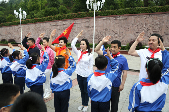 28日上午9:00赶到革命老区的艺术家们在金寨红军广场参加了庄严的少先队入队仪式,80多名新队员正式加入少先队员。艺术家们为他们佩戴上红领巾,互敬少先队队礼,一起重温入队誓词,并唱响少先队队歌,当广场响起“我们是共产主义接班人”的旋律时,大家似乎都回到了少年时代,重获积极向上的力量。挥之不去的少先队情怀,是每个少年儿童梦想的起点,鲜艳的红领巾,是永不褪色的旗帜,童声的真挚誓言,是唱响祖国未来的最强音。